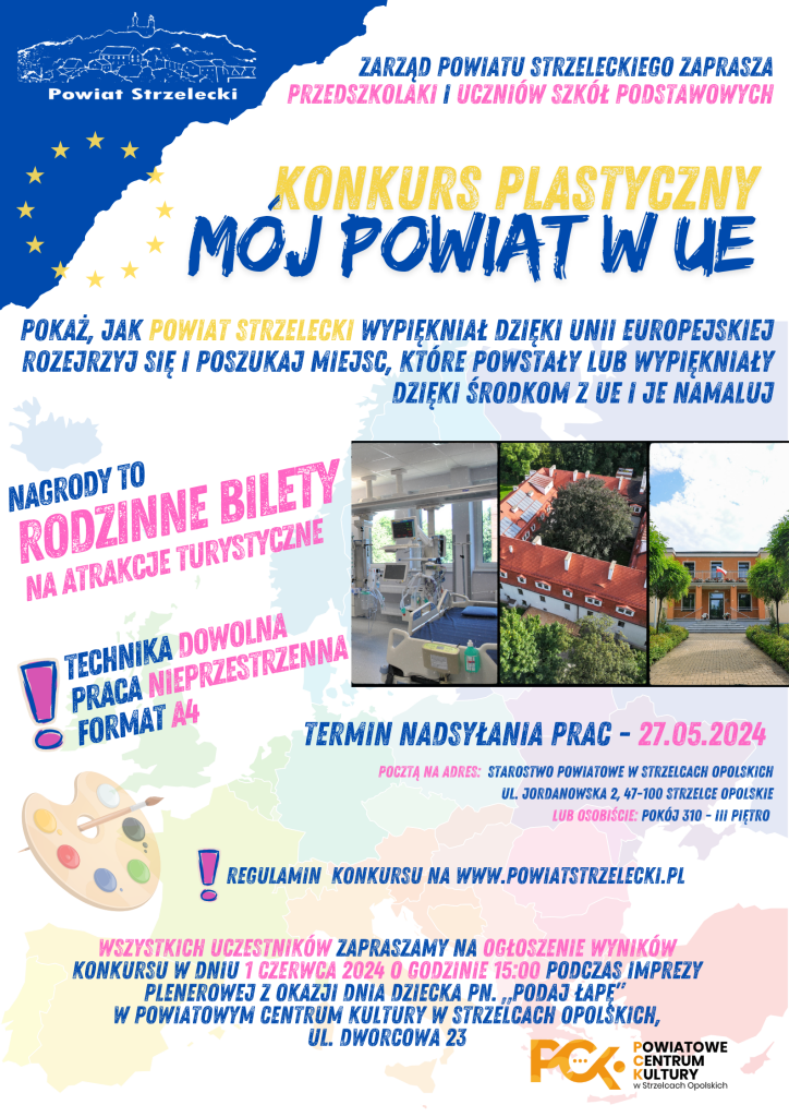 Konkurs plastyczny – Mój powiat w UE 21 maja 202421 maja 2024 webmaster Przedszkolaki i uczniów zapraszamy do wzięcia udziału w konkursie plastycznym którego termin nadesłania prac do 27 maja 2024 a temat to „Mój powiat w UE”. Szczegóły na plakacie.