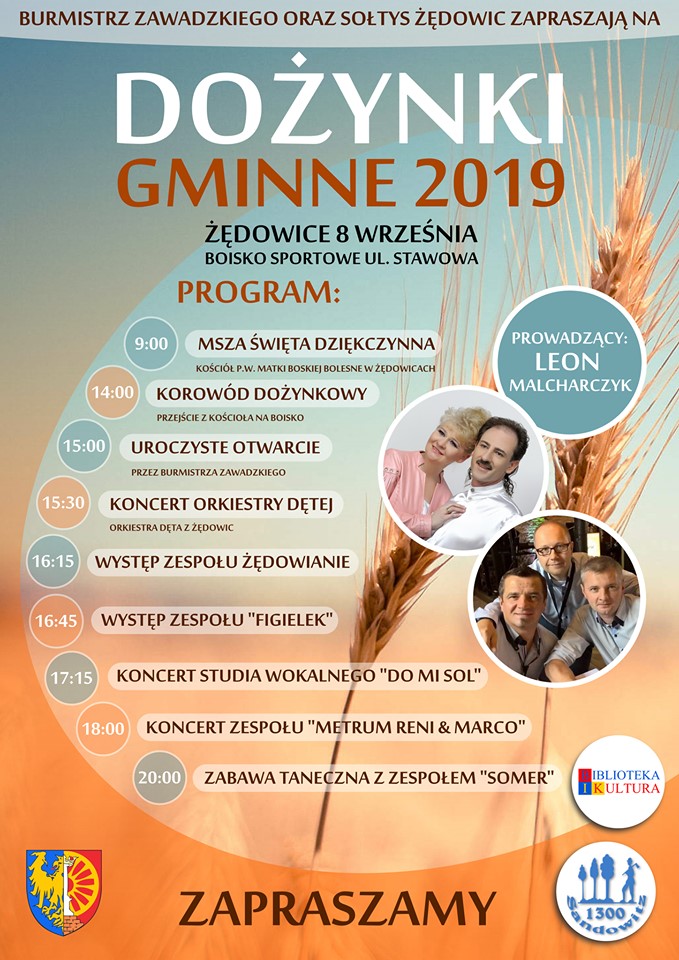 Mamy już informację o Dożynkach Gminnych 2019 – w tym roku wszyscy mieszkańcy są serdecznie zaproszeni dnia 8 września (niedziela) na obchody do Żędowic. W programie oprócz Korowodu wiele występów artystycznych począwszy od orkiestry dętej po zespoły wokalne. Wieczorem o godz. 20:00 odbędzie się zabawa taneczna, dla Państwa zagra zespół Somer.